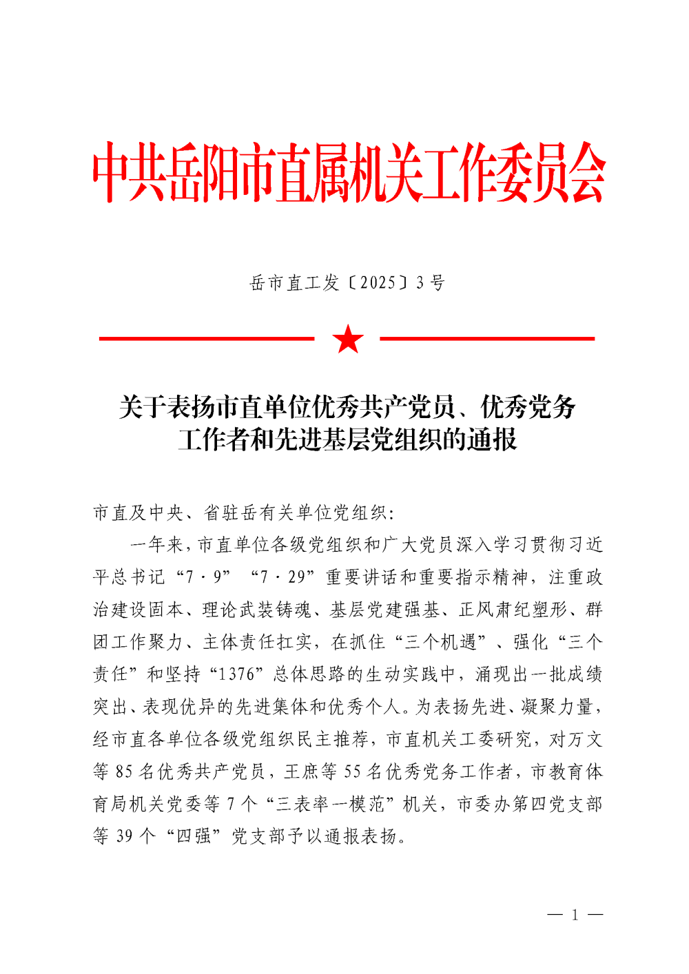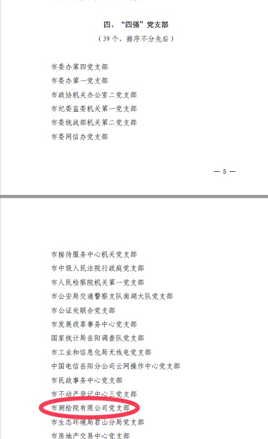 近日,中共岳阳市直属机关工作委员会印发《关于表扬市直单位优秀共产党员、优秀党务工作者和先进基层党组织的通报》(岳市直工发〔2025〕3号)。中共岳阳市测绘院有限公司支部委员会荣获“四强”党支部,公司支部书记、董事长郑君荣获“优秀党务工作者”荣誉。